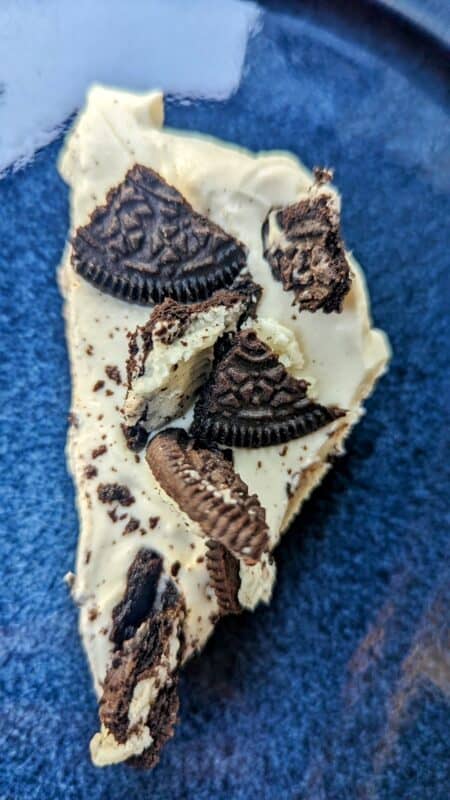 • Kekse darüber bröseln und Kuchen für mindestens 2h in den Kühlschrank geben, damit die Creme etwas härter wird.