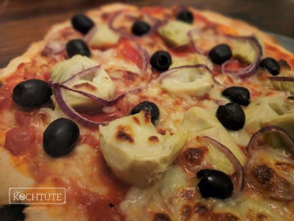 Belegt wird die Pizza mit Artischocken, Kalamta-Oliven, Roten Zwiebeln und Mozzarella. Das Highlight ist die Zitronen-Knoblauch-Vinaigrette. Die gibt nochmal ordentlich Bums. Das i-Tüpfelchen auf der Pizza sozusagen. Mamma Mia!:)