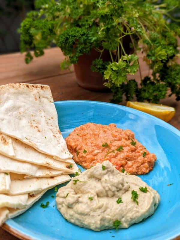 Geile Dips mit lecker Fladenbrot: Baba Ganoush ist geschmorte Aubergine mit Tahini, Zitrone, Knoblauch und Olivenöl und Muhammara ist eine Paprika-Walnuss-Paste mit Harissa und Granatapfel-Melasse.