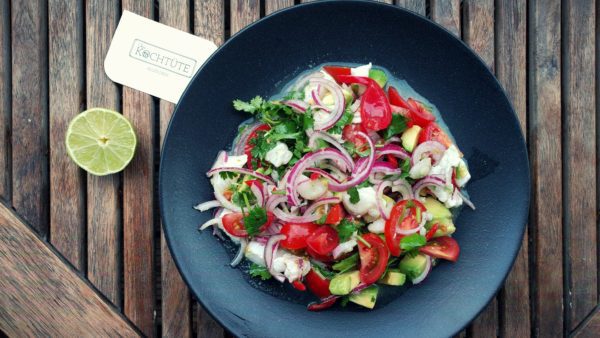 Ceviche – Peruanischer Salat mit frischem Kabeljau, Avocado und Cocktailtomaten