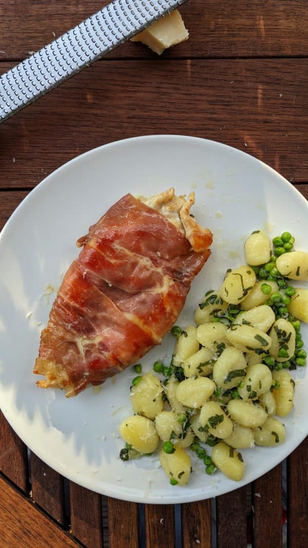 Wenn Du überlegst, was Du dir diese Woche gönnen sollst: Think no more. Saftiges Kikok-Hühnerbrustfilet umarmt von luftgetrocknetem Parmaschinken und frischem Salbei. Dazu Gnocchi angebraten in Salbeibutter mit ein paar knackig-grünen Erbsen. Hmmmm Hammer.
