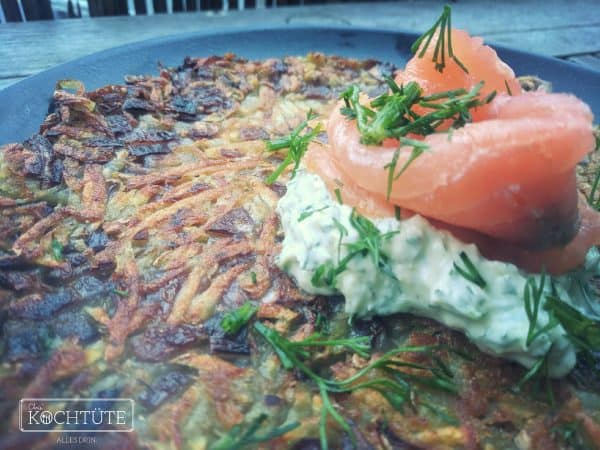 Räucherlachs auf Kartoffelrösti mit Meerrettich-Dill-Sour Cream
