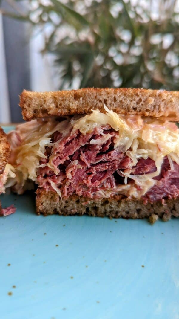 Zarte Pastrami aus der geräucherter Rinderbrust auf in Butter geröstetem Roggenbrot, dazwischen gesellen sich süßliches Sauerkraut und zart schmelzender Emmentaler-Käse. Wenn dann noch das Russian-Dressing mit Mayo, Ketchup, mildem Meerrettich, einem Schuss Tabasco und Worchester-Sauce kommt, wird daraus ein Gedicht. Ein Kult-Sandwich. Zu Recht.