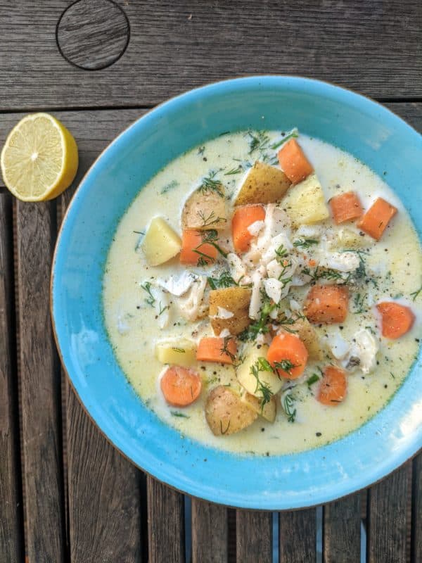 Wärmender Fischeintopf lowcarb, schwedisch angehaucht mit Sahne, MSC-Zertifiziertem Rotbarsch aus Wildfang, Kartoffeln und frischem Dill. Super easy zu machen, super vollmundig.