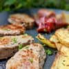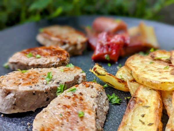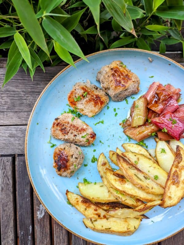 Zarte Schweinefilet-Medaillons vom Duroc Schwein in süß-säuerlichem Rhabarber-Thymian-Kompott mit Ofen-Rosmarin-Kartoffeln. Auf dem Teller perfekte Harmonie.