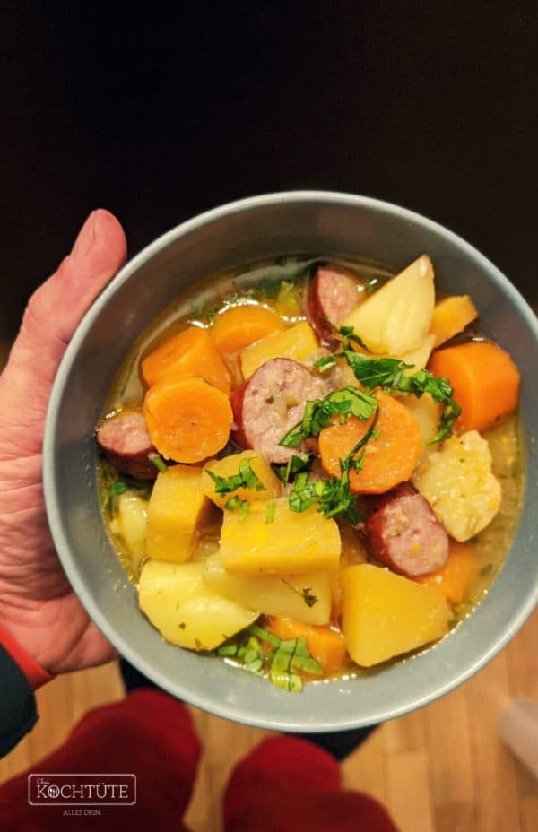 Fröhlich das frische Gemüse geschnippelt, mit den Zutaten gekocht und fertig! Passend zum Wetter dieser sehr schmackhafte Eintopf! Hatten die Mettendenvariante. Perfekt!