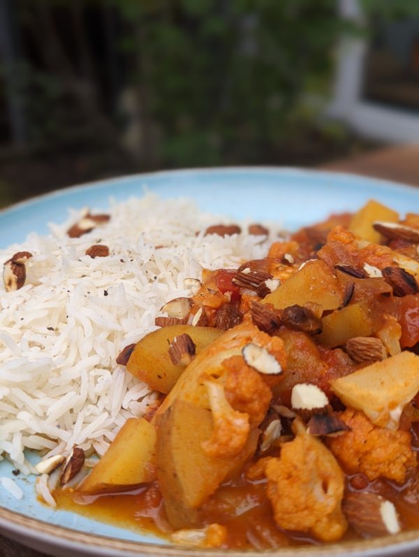Syrische Veggie-Tajine mit Gemüse, Mandeln und Basmatireis