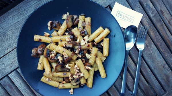 Das Trüffelöl riecht schon toll, die Walnüsse sind schön knackig und mit Pilzen und Pasta ist es einfach ein leckeres Rezept.