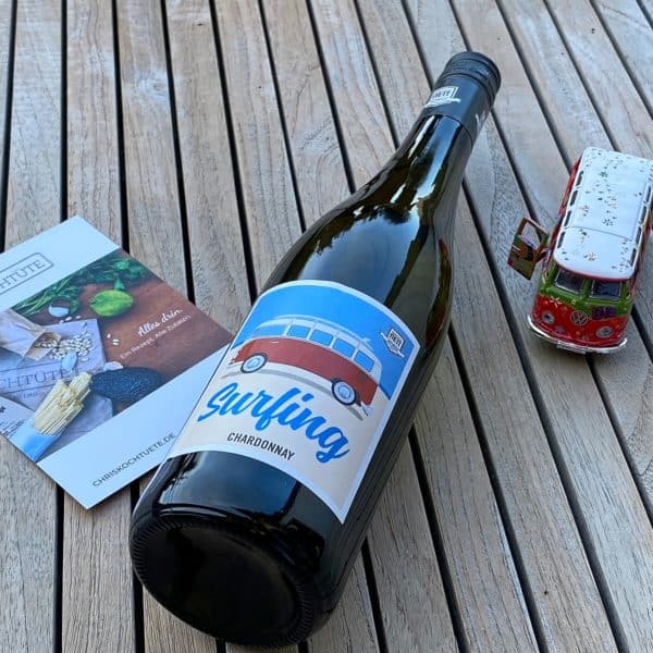 Einen besonders entspannter Chardonnay namens „Surfing“! Schmeckt nach Sommer, Sonne und jeder Menge guter Laune. Passt unseren Kochtüten und zur Musik von den Beach Boys :)